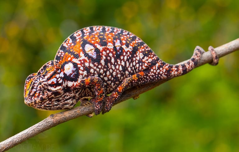 該變色龍全長 23-25 公分(不含尾巴的鼻孔長度 9-10 公分),屬於小型至中型變色龍。它們擁有由紅、黃、黑、藍四色斑點組成的色彩斑斕、複雜的圖案——這就是它們俗稱「地毯變色龍」的原因。雌性主要擁有這種鮮豔的色彩,雄性則略顯低調,呈綠白色或黃白色。雌性和雄性都可見白色側紋和環狀深色花紋。在其分佈區的邊緣——伊薩魯,我們發現了雌性Furcifer lateralis,它們的皮膚呈現出明顯的均勻的紅寶石色或粉紅色。該物種所有標本的頭盔都很低,並且略微向後延伸,因此幾乎不會覆蓋背部。頂冠由14至20個鱗片組成,通常位於深色或紅棕色的基底上。與Furcifer major不同,Furcifer lateralis擁有類似Furcifer viridis的腋窩紋。幼年Furcifer lateralis通常仍保留有喉冠,但會隨著年齡的增長而消失。一些幼苗呈現出明亮的霓虹綠色。