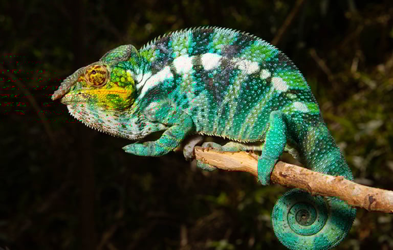 控霸 (Nosy Komba)原產於馬達加斯加,以獨特的綠藍色調著稱,是許多變色龍愛好者心中的夢幻物種。成體尺寸約為20公分,白天建議溫度26~30度,晚上15~24度。適合人工飼養(★★★★☆),但在台灣市場較不常見(★★☆☆☆)。控霸 (Nosy Komba) 屬於在馬島西北部的外島. 鄰近諾西貝(nosy be) 及安基菲(ankify), 所以有些個體有著進階版的諾西貝的藍, 也有安基菲的尖頭部份. 市場非常少見.