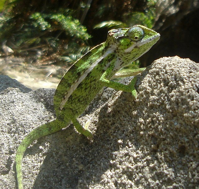 該變色龍全長 23-25 公分(不含尾巴的鼻孔長度 9-10 公分),屬於小型至中型變色龍。它們擁有由紅、黃、黑、藍四色斑點組成的色彩斑斕、複雜的圖案——這就是它們俗稱「地毯變色龍」的原因,雌性主要擁有這種鮮豔的色彩;雄性則略顯低調,呈綠白色或黃白色。雌性和雄性都可見白色側紋和環狀深色花紋。